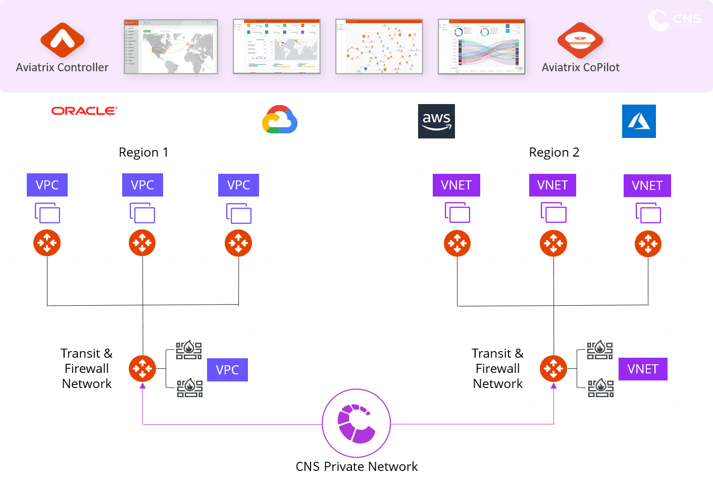 Cloud Networking combines CNS’s private network and an unparalleled cloud network platform to create an enterprise-class network inside and between public clouds, up to the VPC/VNET level.