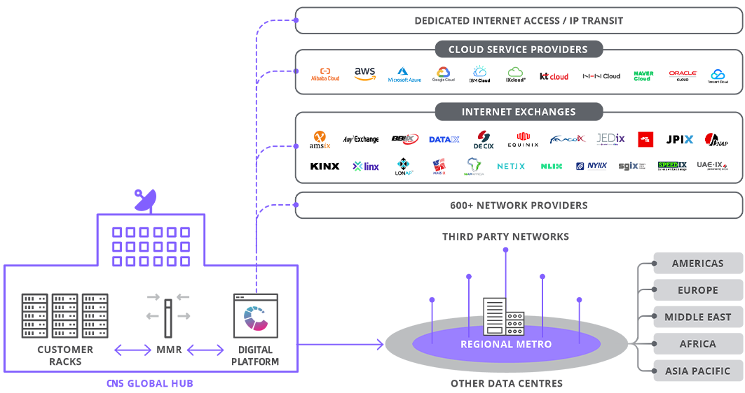 By being present at CNS’s facilities, you gain unparalleled access to a growing partner ecosystem as well as a comprehensive set of global connectivity solutions. We can provide you with an end-to-end solution that connects you from your enterprise location all the way to the cloud.